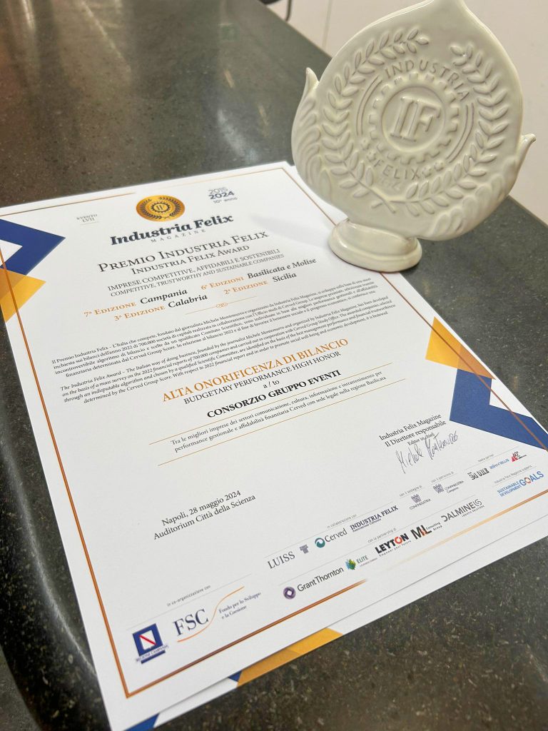 Il riconoscimento è stato attribuito al Consorzio Gruppo Eventi; il Presidente Vincenzo Russolillo ha dichiarato: “Siamo felici e soddisfatti di ricevere questo importante riconoscimento: il Consorzio Gruppo Eventi si conferma tra le migliori imprese dei settori comunicazione, cultura, informazione e intrattenimento, per performance gestionale e affidabilità finanziaria. Un percorso lungo che riusciamo a portare avanti grazie all’aggiornamento e alla formazione continua e che ci ripaga ogni giorno di tanti sacrifici, regalandoci grandi soddisfazioni”.