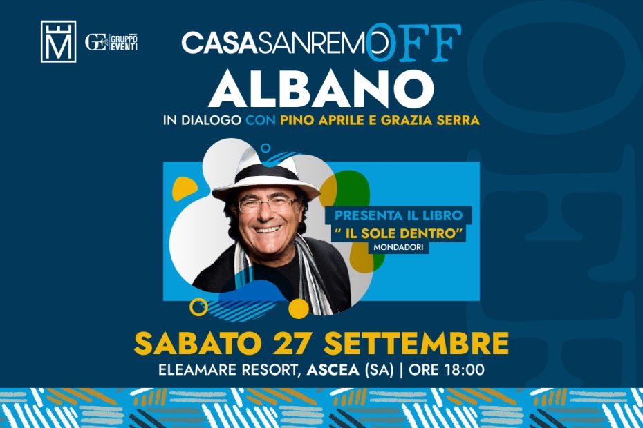 Il prossimo sabato 27 settembre, alle ore 18:00, presso l’incantevole cornice dell’Eleamare Resort di Ascea… Leggi tutto »Casa Sanremo OFF: Albano presenta “Il sole dentro”